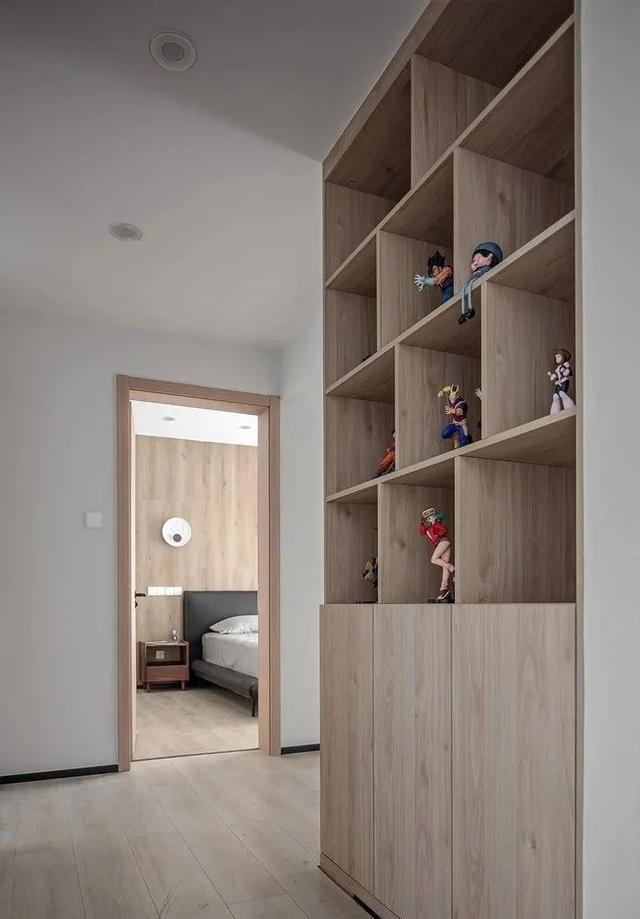 3、借用书房小面积,移动主卧门的位置,避免与入户门正对,还增加主卧储物空间,也预留出特意展示手办的储物柜。