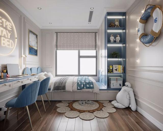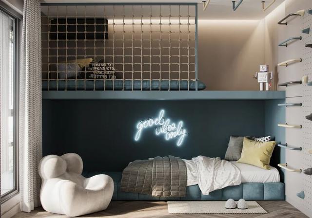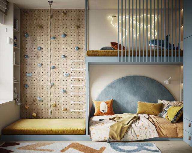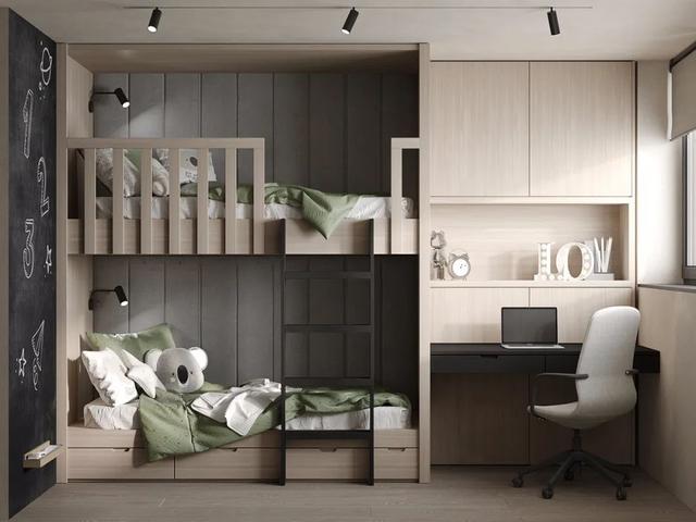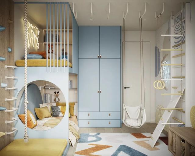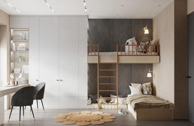 01.能够节省空间,把空间的高度方向,也就是立面的空间充分利用起来,儿童房省出来的其他区域可以满足更多其他的功能,比如游戏玩耍区、学习区等等,如果是一个小孩居住的话,可以上床下桌、上床下柜,或者上床下活动区等等,布置可以有非常多的形式。