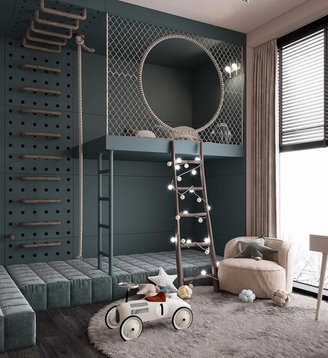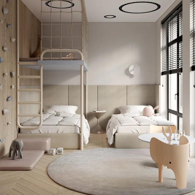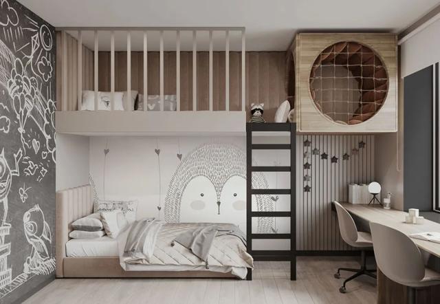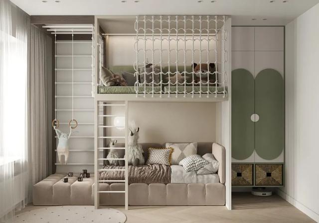 但是儿童房所用的高低床,其外观造型,所包含的功能,以及在安全的保护上要更优于传统宿舍的上下床。