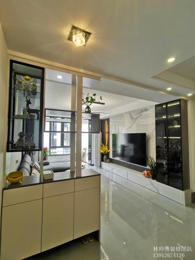 这是一个开门见厅的户型,所以为了保护隐私,在大门口和客厅之间做了隔断来缓解,隔断下半部分是储物,上面是镂空的,这样能保证采光。门口另一面是餐厅的餐边柜,增加家里的收纳能力。