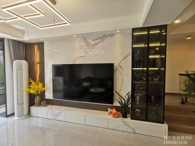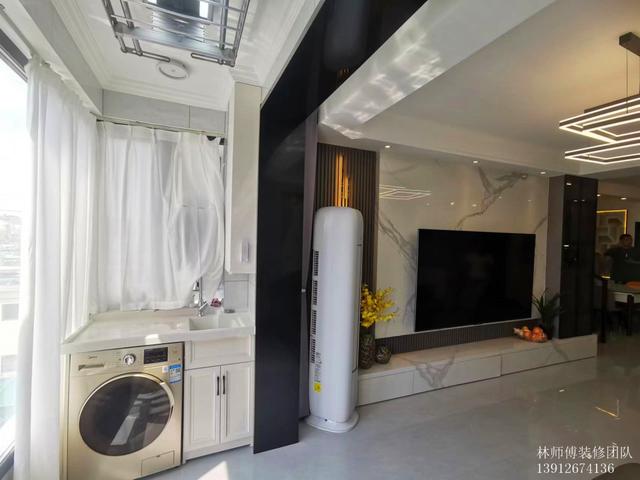 电视背景墙是大理石,一整块大理石看着就大气,电视机两侧,一侧做了木饰面装饰,让整个空间柔和了不少,另一侧是做了展示柜,并带有藏光,也是非常大气美观的。外面连接的阳台,洗衣机收纳进橱柜,整体统一。
