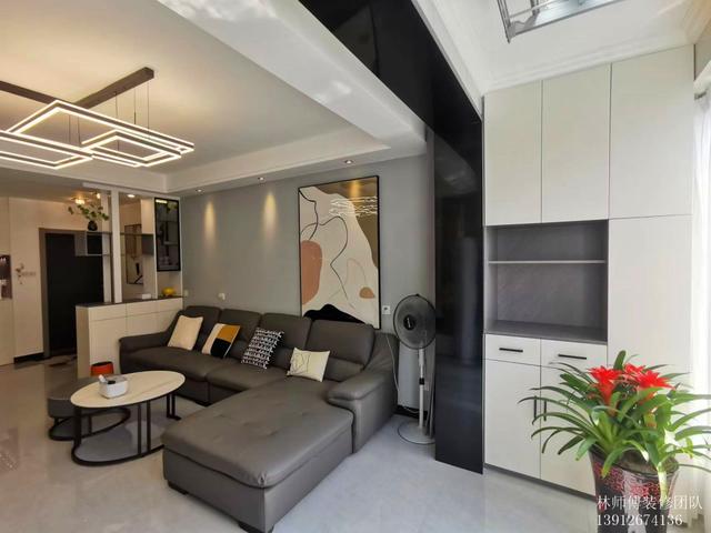 沙发背景墙也是简约的乳胶漆,高级灰的配色也是相当大气的,再加一幅艺术画,让整个墙面更有层次、更立体了。沙发是皮质的,坐着很舒服哦。错层的小茶几也是简约轻奢的,而且不占地方,让客厅看起来更大。外面连接的阳台,也做了储物柜帮助收纳。