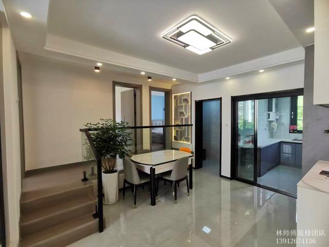 餐厅这里有个错层,区分休息区域和活动空间两个地方,楼上是房间,楼下是客餐厅。餐桌靠边放,能空出更多的活动空间,边上有放置一盆绿植,郁郁葱葱,充满生机。