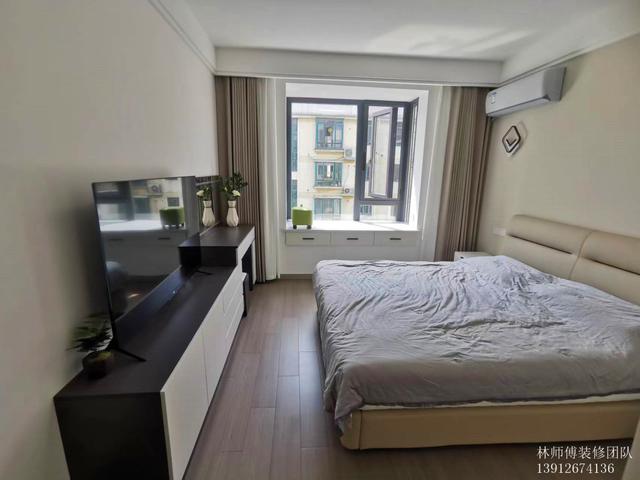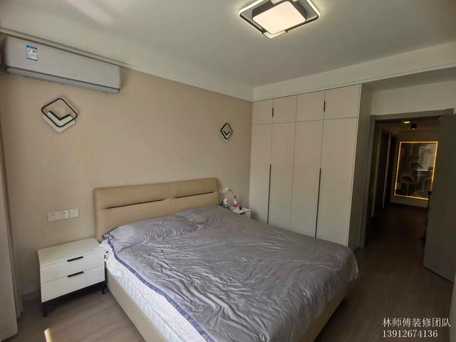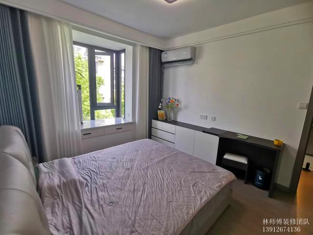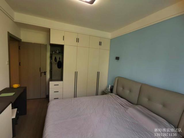 次卧换了背景色,蓝色的背景墙更加清新自然,衣柜的一格做了开放设计,方便放一些常用物品。床尾也有一组矮柜,既可以用来收纳,也可以作为临时的办公桌使用。