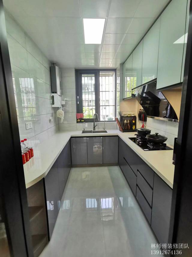 厨房u型设计,增加收纳能力,配菜、洗菜、烹饪,操作合理,烟灰色橱柜+白色台面,清爽整洁。