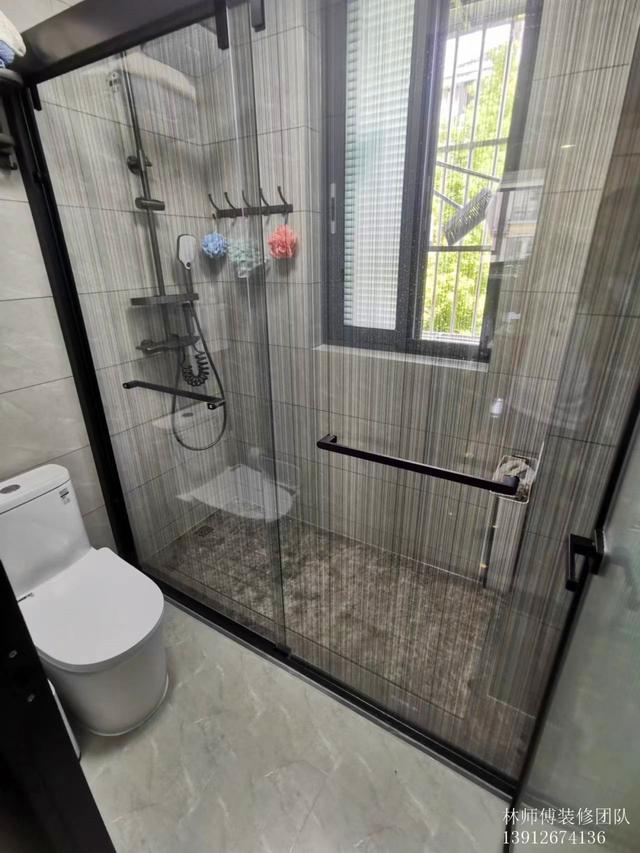 卫生间干湿分离,方便打扫,灰色瓷砖也是很耐脏的。淋浴房还设计了挂钩,挂毛巾或者浴球都很方便。