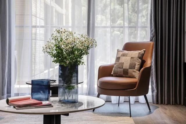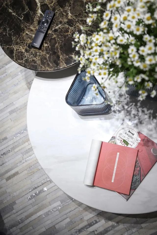 ▲两张圆形的石材茶几,布置上花瓶与杂志,也让客厅氛围显得更加自然舒适。