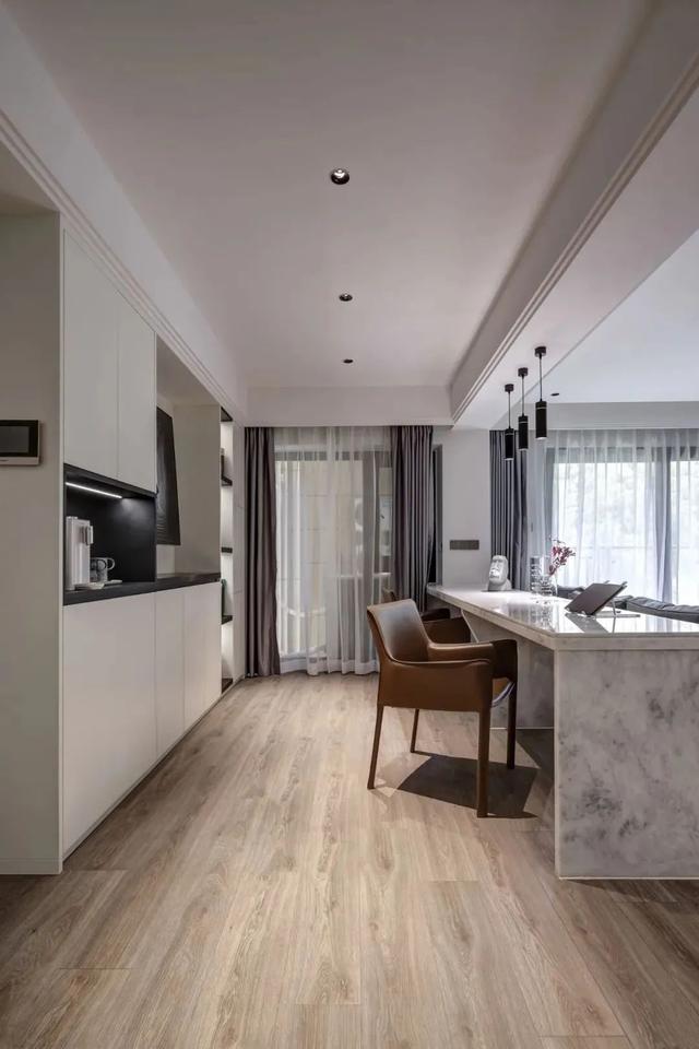 ▲餐厅就设在客厅与办公区旁的过道上,摆上一**代端庄的餐桌椅,还有绿植的装饰布置,让用餐空间也更加清新舒适而大气。