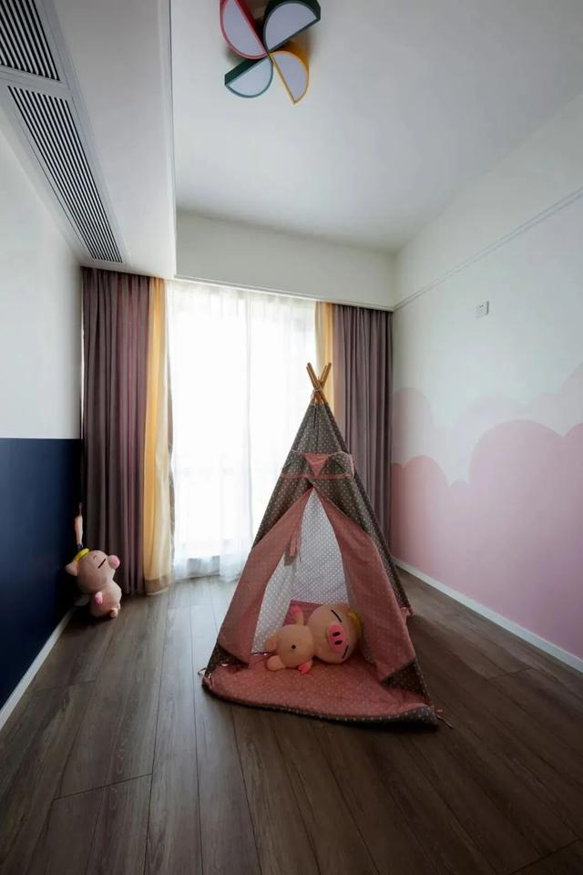 ▲儿童房暂时留空布置小帐篷与小公仔,显得格外的可爱,左侧蓝色墙脚+乳白色墙身,右侧墙面则是以粉色渐变的云团拼色墙,也让空间显得更加童趣而活泼可爱。