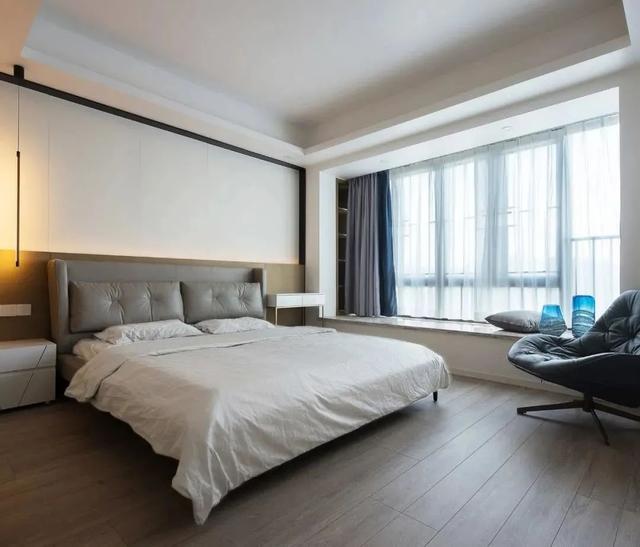▲卧室在简约大方的空间基础,床头墙的墙脚区域是木饰面的材质,摆上卡其色的皮艺床,素白的床单,简单舒适的卧室空间,让睡眠环境更加轻松自然。