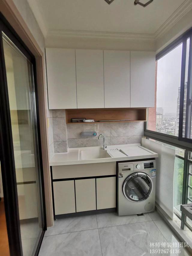 阳台也是做了收纳的柜子,洗衣机收纳进柜子里,干净整洁,能满足日常的使用需求。