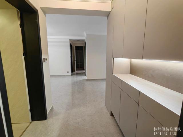 玄关是一面到顶的鞋柜,白色的柜子内搭藏光,让人一进屋就能感觉到家里的温馨。柜子中间留空用来摆放饰品或者常用的随身物品,非常便捷,底下也是悬空的,用来收纳鞋子,保持门厅整洁。