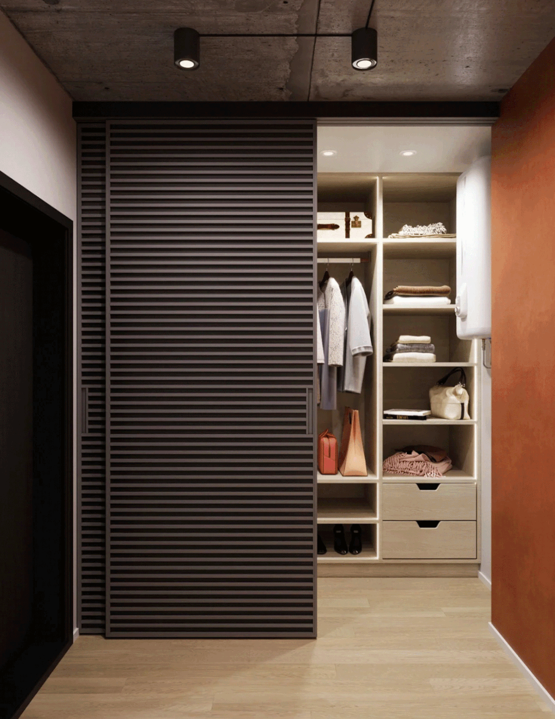 玄关面积稍微大一点的(下图:2.4㎡),可以合理划分区域,把部分区域改造成衣帽间与储物间结合。内部大部分采用开放柜体,除去柜门所占的区域,既美观还通风透气,重点是还能解放卧室的部分区域。