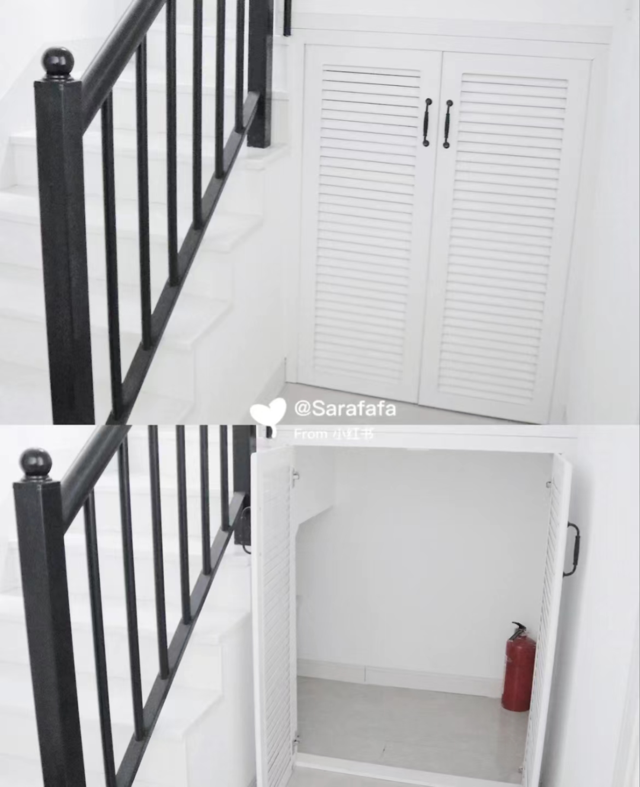 如果你家是LOFT,或者复式,那楼梯的位置,同样可以。架上层板,根据实际需要存放的东西调整高度。选用与墙面同色系的门,不仅不会突兀,反而更有造型感。