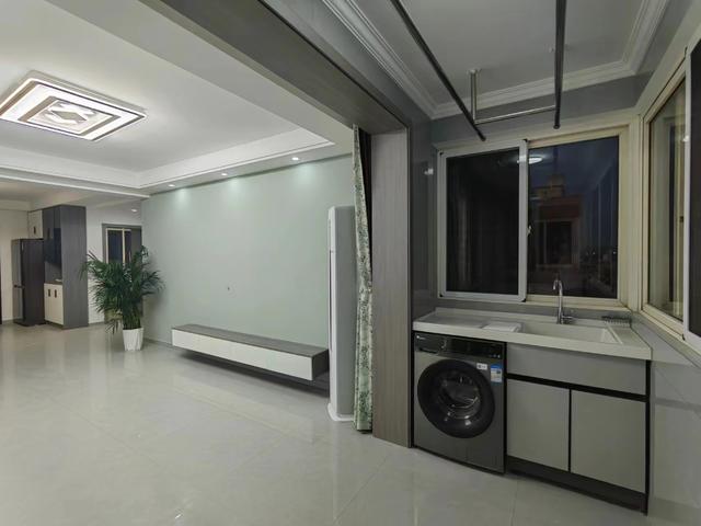 客厅和阳台打通了,这样能让客厅显得更加宽敞大气。阳台主要是洗晒,收纳进橱柜的洗衣机,整洁又清爽。
