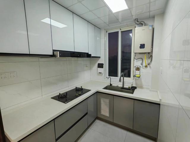 厨房里面是L型的工作台,动线合理,收纳充足。台面、橱柜都采用了浅色系,让整个餐厅更加敞亮。