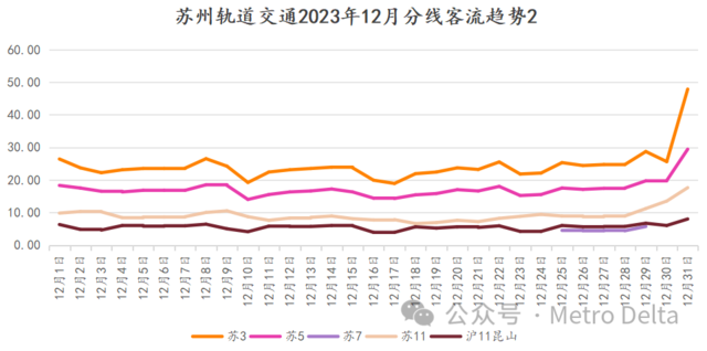 剩余线路合并为第二梯队,各线仍然在各自客流量级保持独立运行,11号线最偏向节假日型,月中贯通改造受到的影响明显大于3号线(注:12月30-31日为估计值,其中31日苏州11+上海11总和为25.61w,姑且估测上海11昆山段为8w)。3号线所受影响稍小,跨年夜也迎来大爆发,接近50w量级,实属惊喜。这也使得本月3号线休息日均值击败工作日。5号线波澜不惊,跨年夜也遗憾未能突破30w,年后有望向日均20w发起冲击。上海11号线昆山段仍维持在工作日6w左右的水平,客流已经比较稳定。