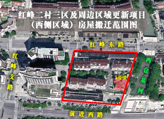 此次拆除的5号楼共22户、1919.21平方米,属于红峰二村三区及周边区域更新项目(西侧区域)范围内。该项目总建筑面积约1.52万平方米,共计搬迁178户,涉及房屋6栋。