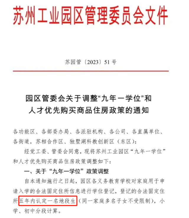 园区调整“九年一学位”政策:园区各义务教育学校对家庭用于申请入学的合法固定住所信息进行学位登记,登记的合法固定住所五年内认定一名地段生(同一家庭多名子女不受限制 ),小学、初中分段计算。