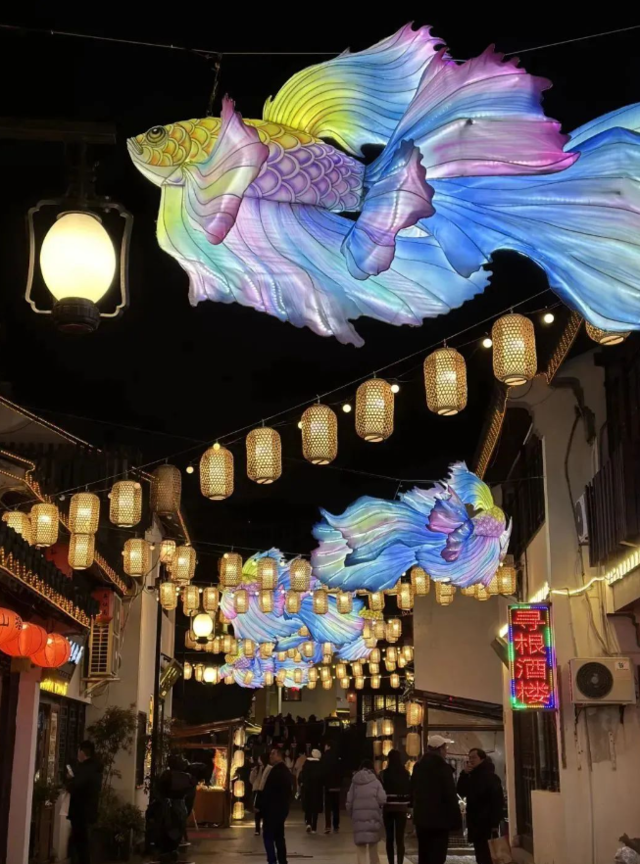 山塘街的方基上,有10条斗鱼鱼灯,大斗鱼有足足2米多长,小的长度也超过1米