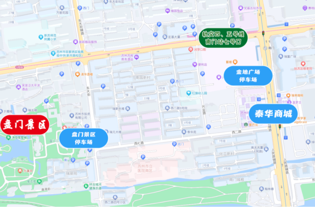 机动车可停放在盘门景区停车场、泰华商城停车场、金地广场停车场。
