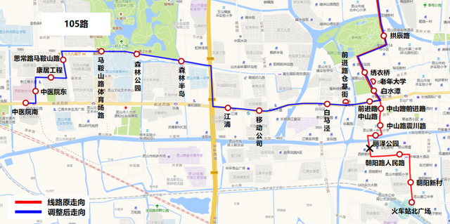 调整内容:取消朝阳路、白马泾路段走向,调整至震川路、同丰路方向,对接友谊医院、宗仁卿纪念医院、第一人民医院等