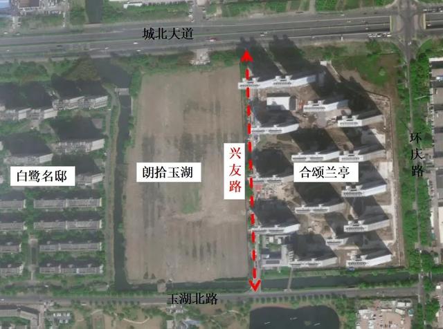 兴友路改扩建工程位于昆山高新区玉湖片区,南起玉湖北路、北至城北大道,道路全长约380米、宽24米,项目于2023年6月开工建设。道路设计为城市支路,双向四车道沥青路面,东侧为已交付的合颂兰亭花园,西侧为在建的朗拾玉湖雅苑。