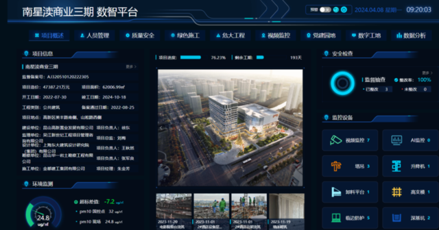 项目建设过程中引入智慧工地管理平台,通过“硬件”设施,运用信息化手段,将施工现场情况集成到高新区云平台,与多端口对接同步,并将产生的数据汇总、建模,形成数据中心,从而实现项目建设全生命周期数字化管理。智慧工地的使用有助于为项目施工决策提供及时、准确的数据支持,进一步推进项目加快建设。