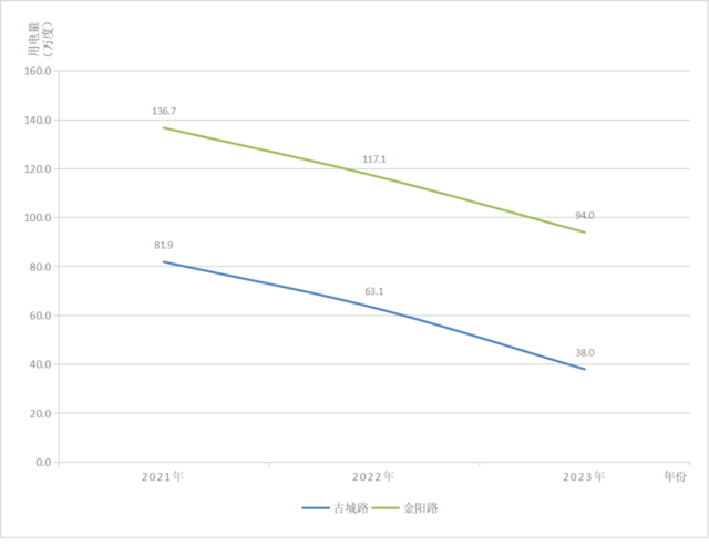 ❖ 古城路(普庆路-机场路):改造前总功率151.5千瓦,改造后总功率94.2千瓦,年电量节省约43.4万千瓦时,实际节电率53%左右。
