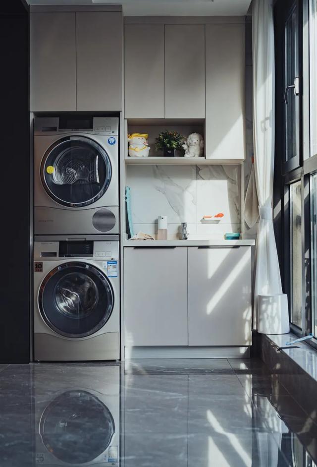 在阳台空间充足的情况下,可以单独隔出一个区域做“洗衣房”,洗衣、晾衣、熨烫等都在同一条动线上,一体化设计让家务动线更流畅,阳台使用起来更便利更舒心。