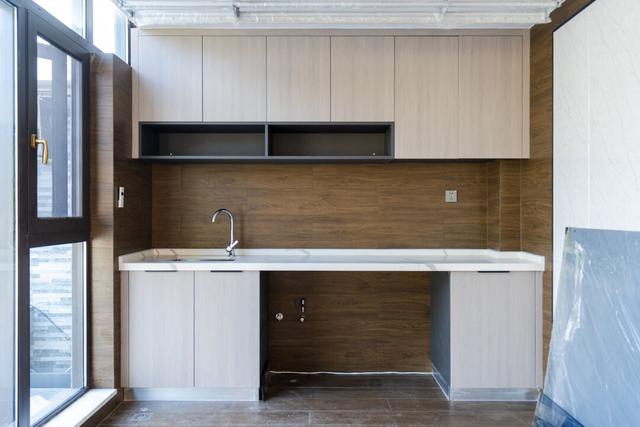 如果觉得吊柜+地柜的组合储物能力较弱,可以考虑高柜+矮柜的组合,用于收纳洗地机、拖把等清洁物品。