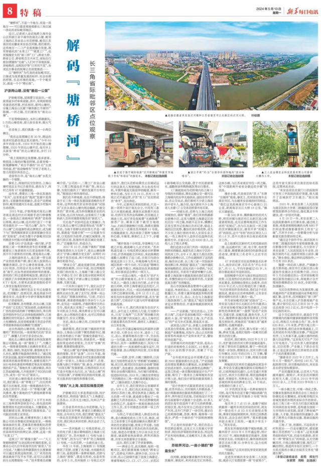 近日,新华每日电讯记者深入走访地跨上海市金山区和浙江省平湖市的南北山塘、毗邻上海的江苏省苏州昆山花桥、毗邻江苏南京的安徽省来安县汊河镇,推出特稿《解码“塘桥河”——长三角省际毗邻区点位观察》。