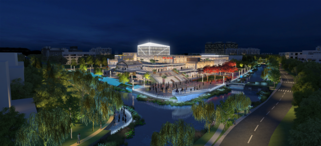 项目两面临河、两侧环路、毗邻居住集中区,设计时采用开放式庭院街区布局,涵盖滨水景观、庭院内街、船头公园、阳光音乐草坪、商业集市外摆等主题空间,缔造新的沉浸式体验打卡路线。