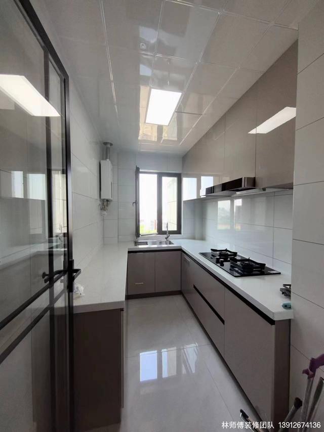 厨房是U型设计,香槟色搭配白色,给人干净明亮的感觉。切配洗,动线设计合理,操作方便。