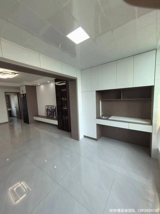 客厅电视墙的两侧,一面做了内嵌橱柜放冰箱,整齐统一。另一面是展示柜,玻璃橱窗内置灯带,颜值非常高。电视墙下面还做了一排抽屉式吊柜,又是收纳的一把好手啊~