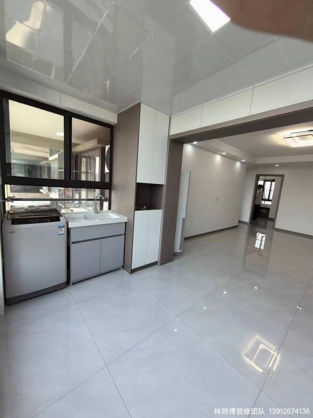 阳台很宽敞,在满足基本日常的洗晒之外,也设计了部分的橱柜,来辅助家里的收纳。同时还设计了一个简约的书桌,方便两个孩子和家长同时需要办公或学习时使用。