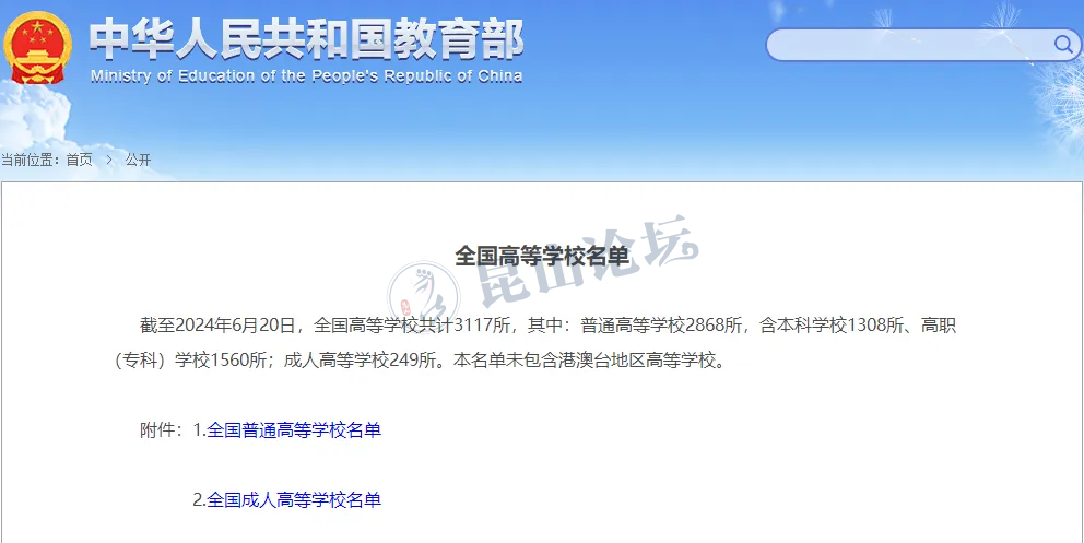 据教育部最新消息:截至2024年6月20日,全国高等学校共计3117所,其中:普通高等学校2868所,含本科学校1308所、高职(专科)学校1560所;成人高等学校249所。本名单未包含港澳台地区高等学校。