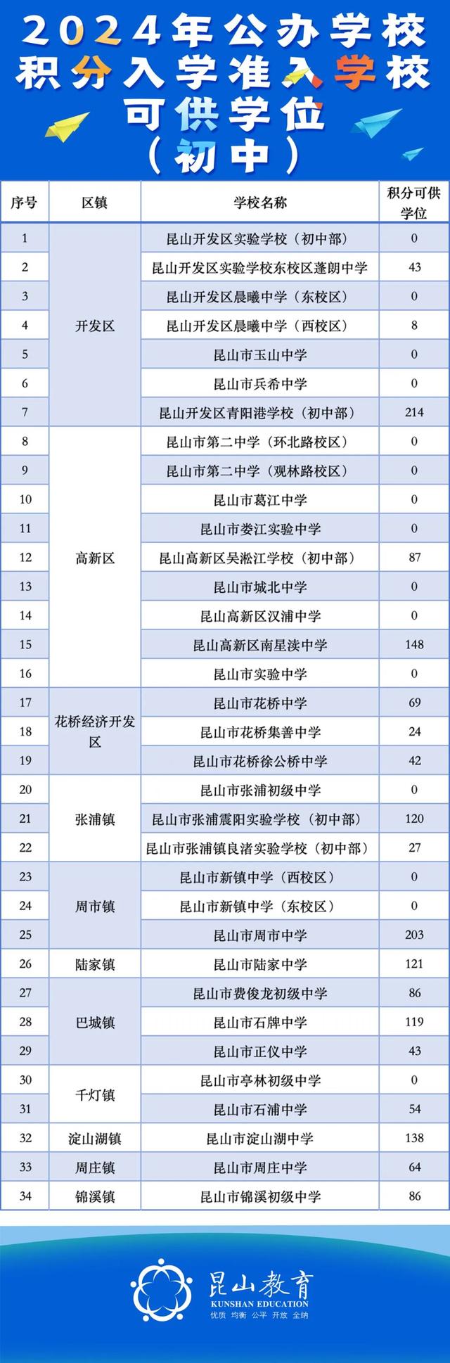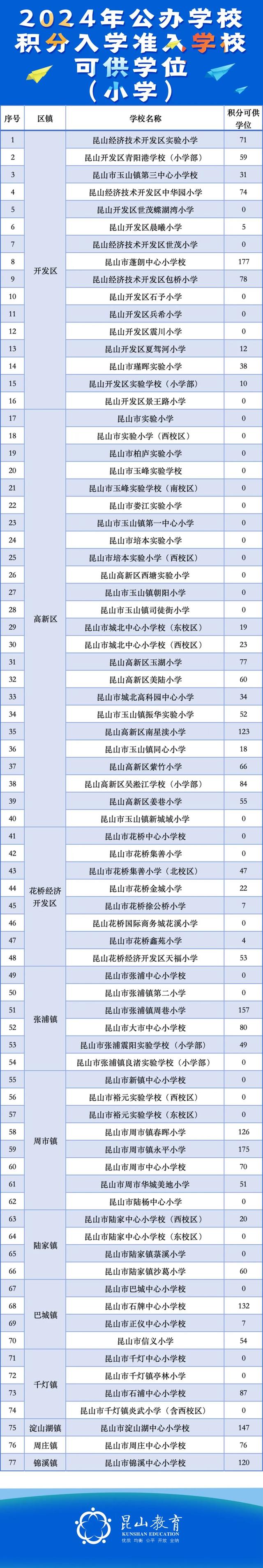 根据《昆山市新市民子女公办学校积分入学办法(修订)》第七条第四款之规定,经市教育局与各区镇会商确定2024年昆山市新市民子女公办学校积分入学准入学校可供学位,现予以公布。