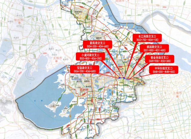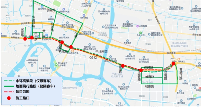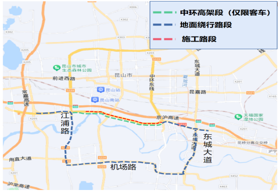 由西往东往上海方向过境的货车车辆可从G312-江浦路-机场路-东城大道-G312道路绕行,由东往西往苏州方向过境的货车车辆可从G312-东城大道-机场路-江浦路-G312道路绕行;客车可从中环南线高架上面以及周边道路绕道通行;非机动车和行人正常通行。