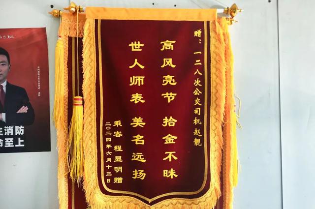 6月11日,公交128路驾驶员赵靓师傅在抵达终点站后,发现车厢前排座位上有一个手包,包内装有手机、身份证等贵重物品,赵师傅立刻上报车队并交由车队办公室妥善保管。车队接到失主拨打的电话,约定时间将失物物归原主。6月14日,失主程先生和夫人一同来到车队,将写有“高风亮节 拾金不昧 世人师表 美名远扬”字样的锦旗赠予赵师傅,感谢赵师傅拾金不昧的行为。