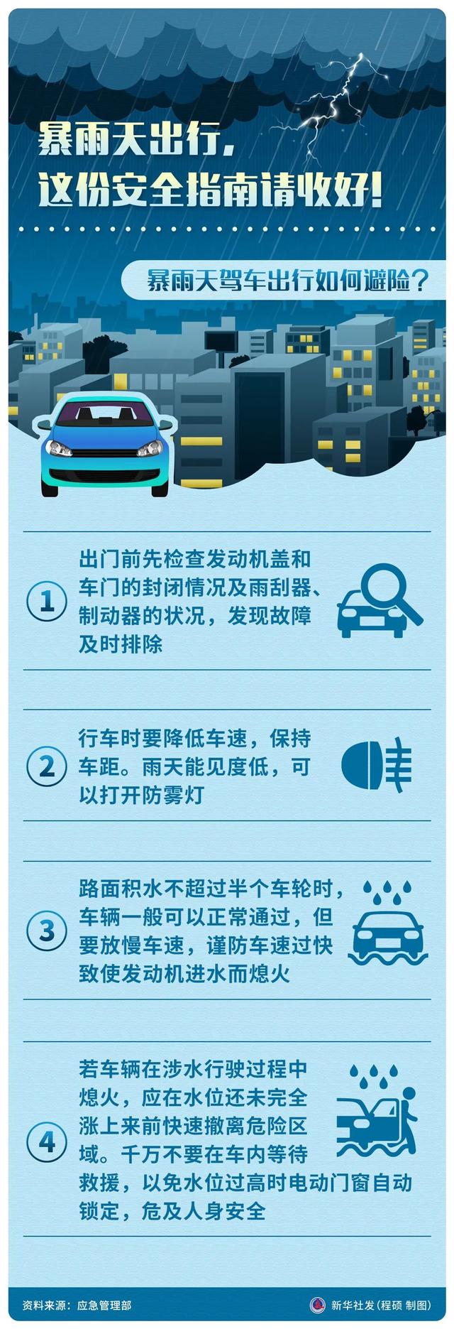 2. 驾车时要降低车速,保持距离,打开防雾灯。驾车出行要确保刹车、转向、雨刷等部件安全有效,遇到积水较深的路段,不要贸然涉水通过,车辆在涉水行驶中熄火,应在水位上涨前快速撤离,不要在车内等待救援。