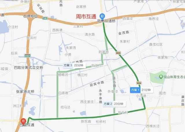 长江北路-城北路-巴城互通(长度14.7km,通过3个红绿灯,用时约21min)