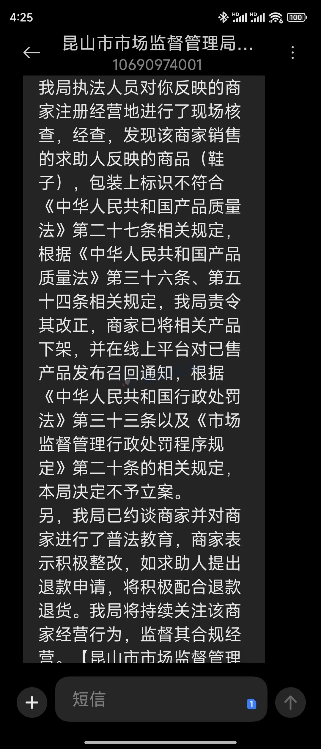 京东平台客服素质太差,那就投诉到昆山12345吧,转市场监督管理局玉山分局办理,9月4日投诉到12345,9月18日给第一次回复,处理投诉时间14天,期间市监未和我联系过了解商品具体情况,直接给的处理意见,说商家有合格证等材料只是没有发,要求商家补充提供合格证等商品标签,通知我去市监局领取商家提供的标签材料。截止今天26日,又过去8天了,没有下文。