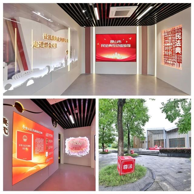 昆山市民法典互动体验馆位于昆山市城市生态森林公园西入口区域,环境优美、人流量大,建成于2022年10月,是当年度昆山市人大十大民生项目之一。展馆内通过文字、图片、音视频、互动游戏、艺术造型等多种形式,生动全面展示了《中华人民共和国民法典》的编纂历程、重要意义、主要内容以及在日常生活中的实践运用。展馆包含序厅、人民至上、典亮昆山、典护一生、与典同行、学典沙龙等专区,集学习性、互动性、参观性于一体。