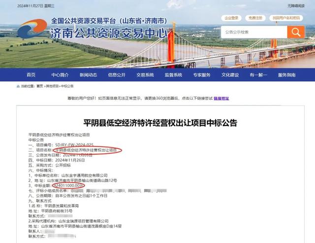 潇湘晨报记者从济南公共资源交易中心了解到,11月26日,该中心官方网站发布了《平阴县低空经济特许经营权出让项目中标公告》,据招标信息显示,中标单位为山东金宇通用航空有限公司,项目招标人为平阴县发展和改革局,项目为出让平阴县低空经济30年特许经营权。