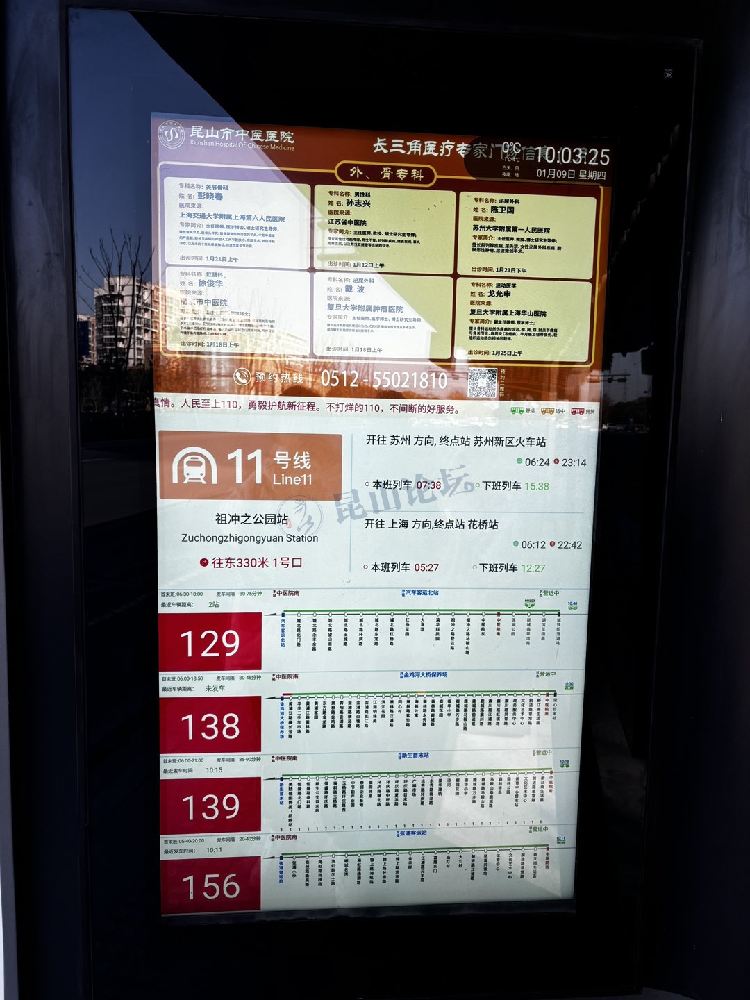 昨天的车放在公司了,老公接回家的,早上只能坐公交车来了。平时因为带孩子出门很少坐公交,发现昆山公交车变化很大,特别便捷,站台上就能看发车时间,车次走到哪里了,而且中医院的站台还能看到专家坐诊时间,11 号线的运行时间,公交车里干净无异味,司机都很礼貌,耐心等待大家上车
