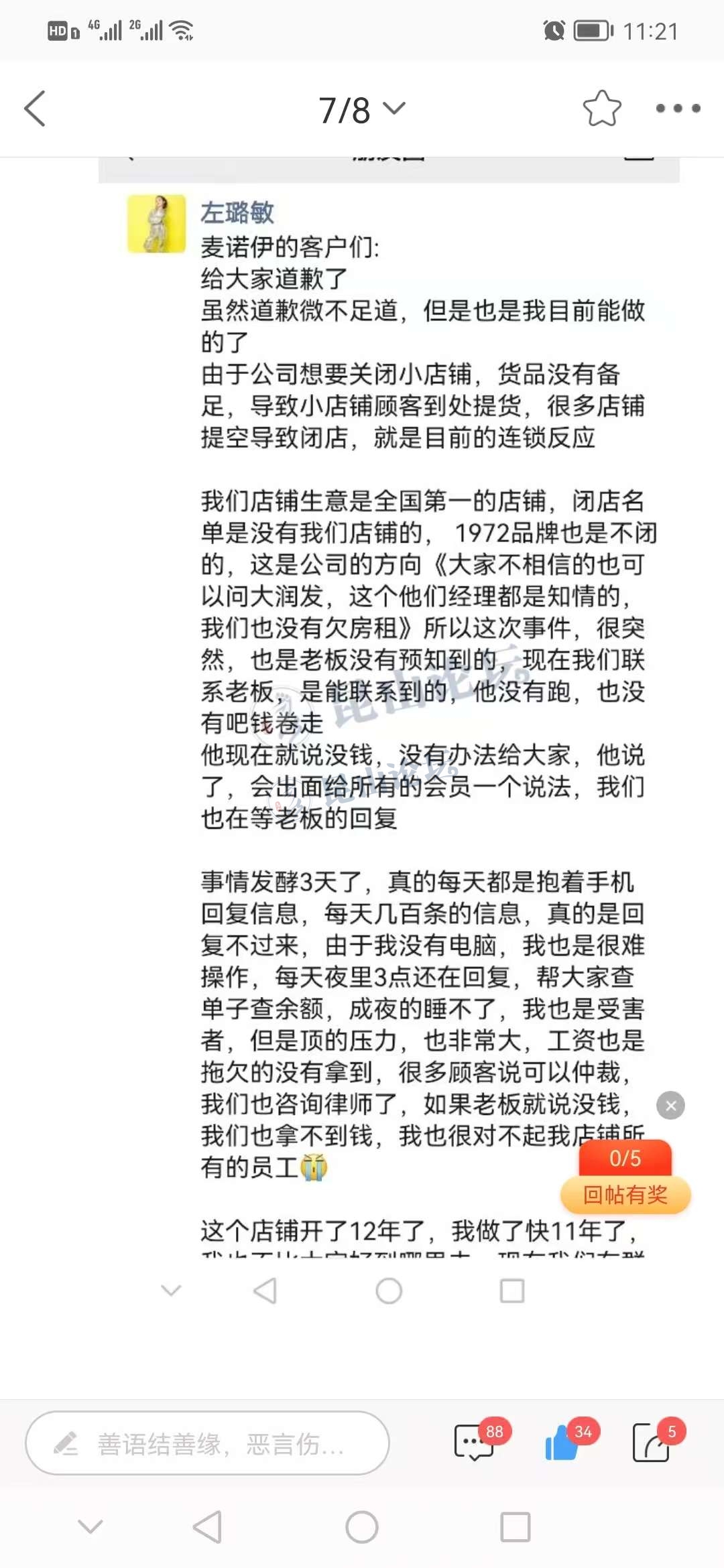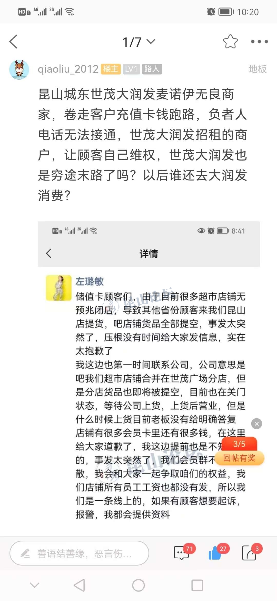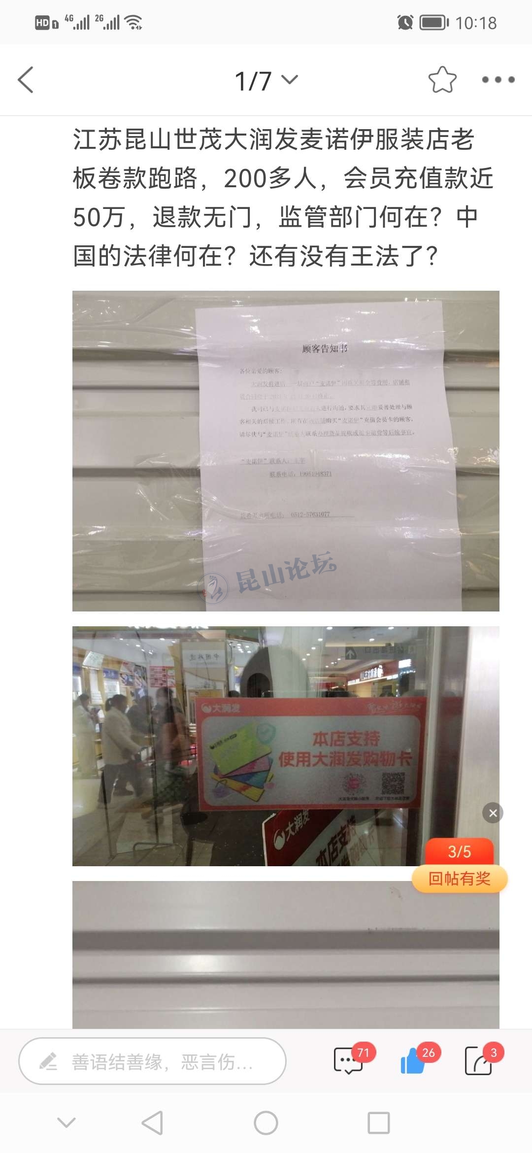 江苏昆山世茂大润发一楼麦诺伊服装店老板卷款跑路,50多万会员充值款退款无门。