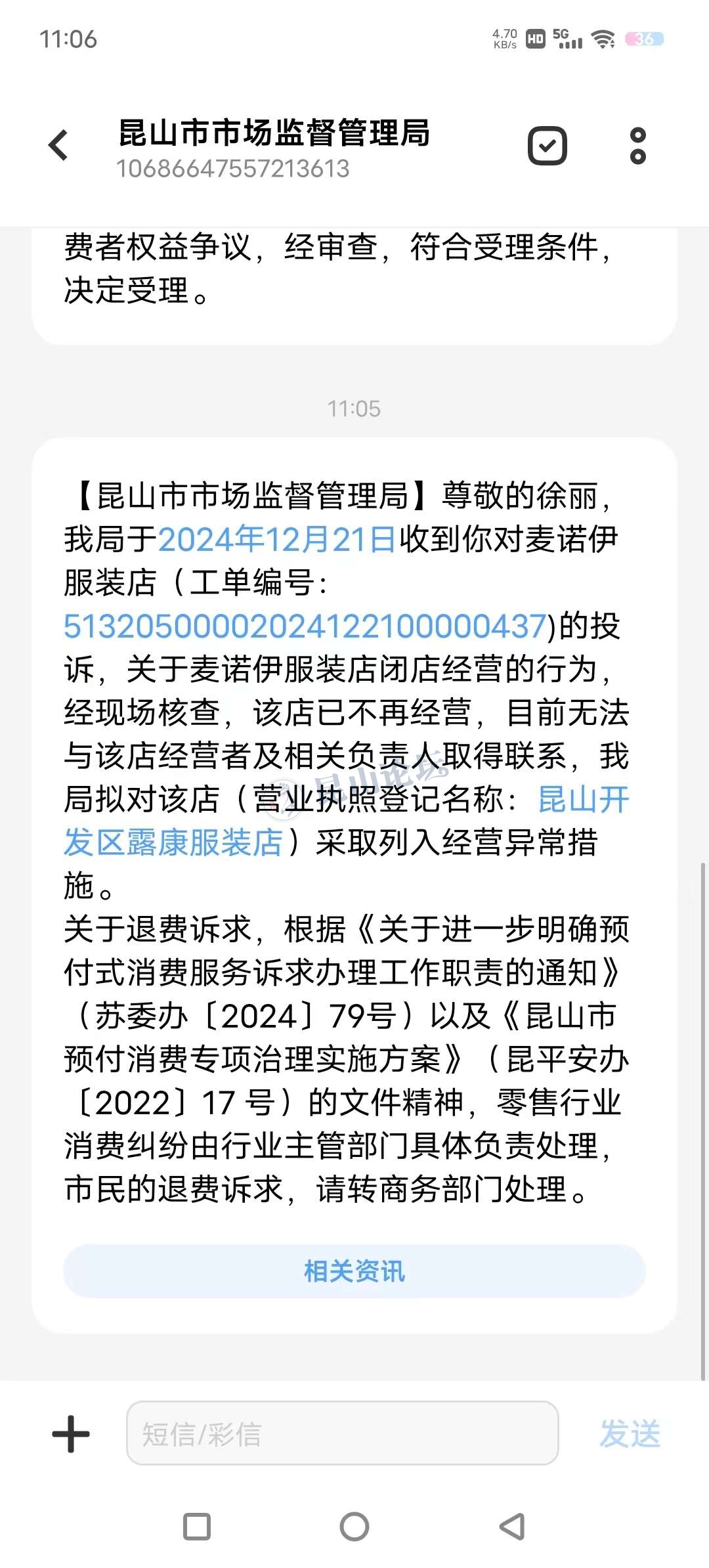 江苏昆山世茂大润发一楼麦诺伊服装店老板卷款跑路,营业执照为昆山露康服饰店,老板卷款跑路前几个月更换为法人孙宁,找一个1962年出生的老人来背锅,老人无财产也不需要工作出门,不怕失信,有预谋的诈骗卷款跑路,监管部门何在?
