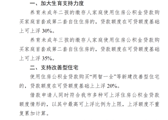 多孩的首套二套公积金可贷额度上浮30%(有两个及以上子女且至少有一个为未成年)