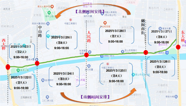 2025年3月22日(星期六)至3月29日(星期六)(雨天顺延),施工期间分段半幅封闭(包括:机动车道、非机动车道、人行道)施工,半幅单向通行。提醒市民出行注意,施工期间请绕行。